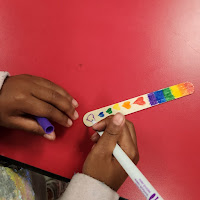 To begin their bat project, 2nd grade watched an educational video about bats. Then students used their own hands to trace and cut out as bat wings. Then they drew details onto an oval paper to create a face, they decorated a craft stick, and then glued everything together. Once dry, students will be able to move their bats back and forth and make them fly!