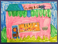 2nd grade discussed different types of stores within our community, and then drew a store of their choice.